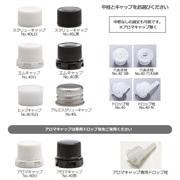 スポイド・スプレー・ポンプと組み合わせる場合や、キャップ類を複数種類で組み合わせたい場合にご利用ください。